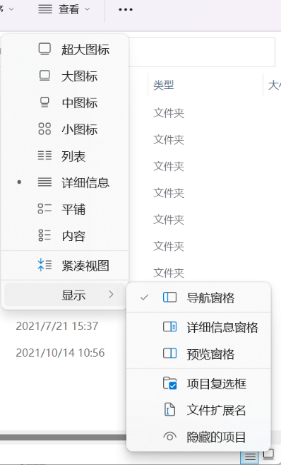 3:点击二级菜单中的“显示”,即可显示隐藏文件和文件夹。